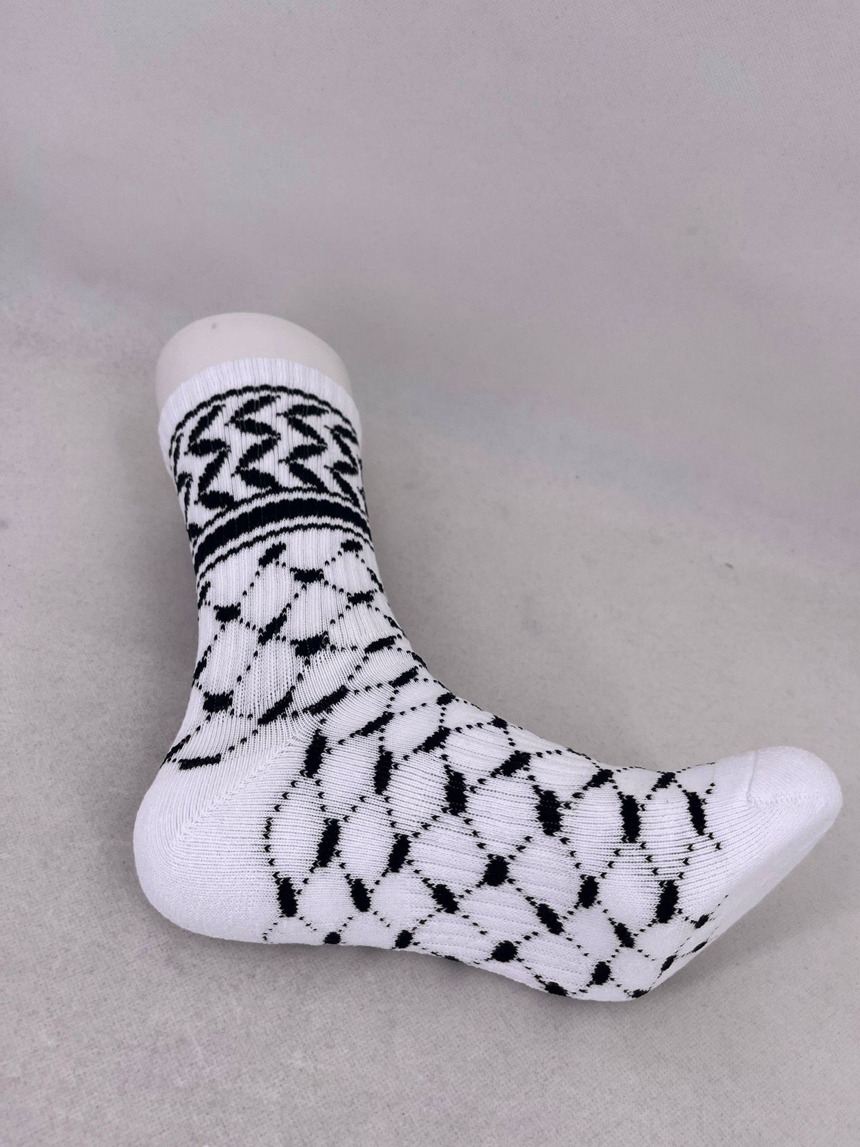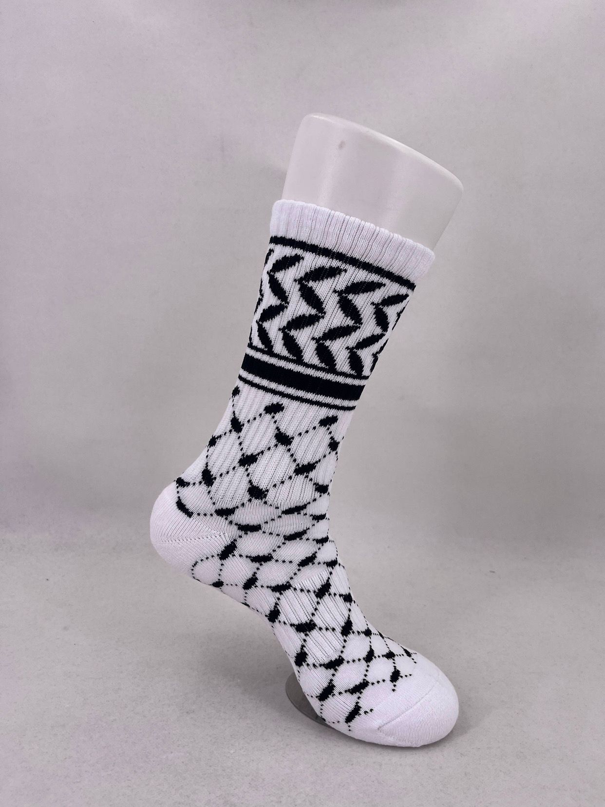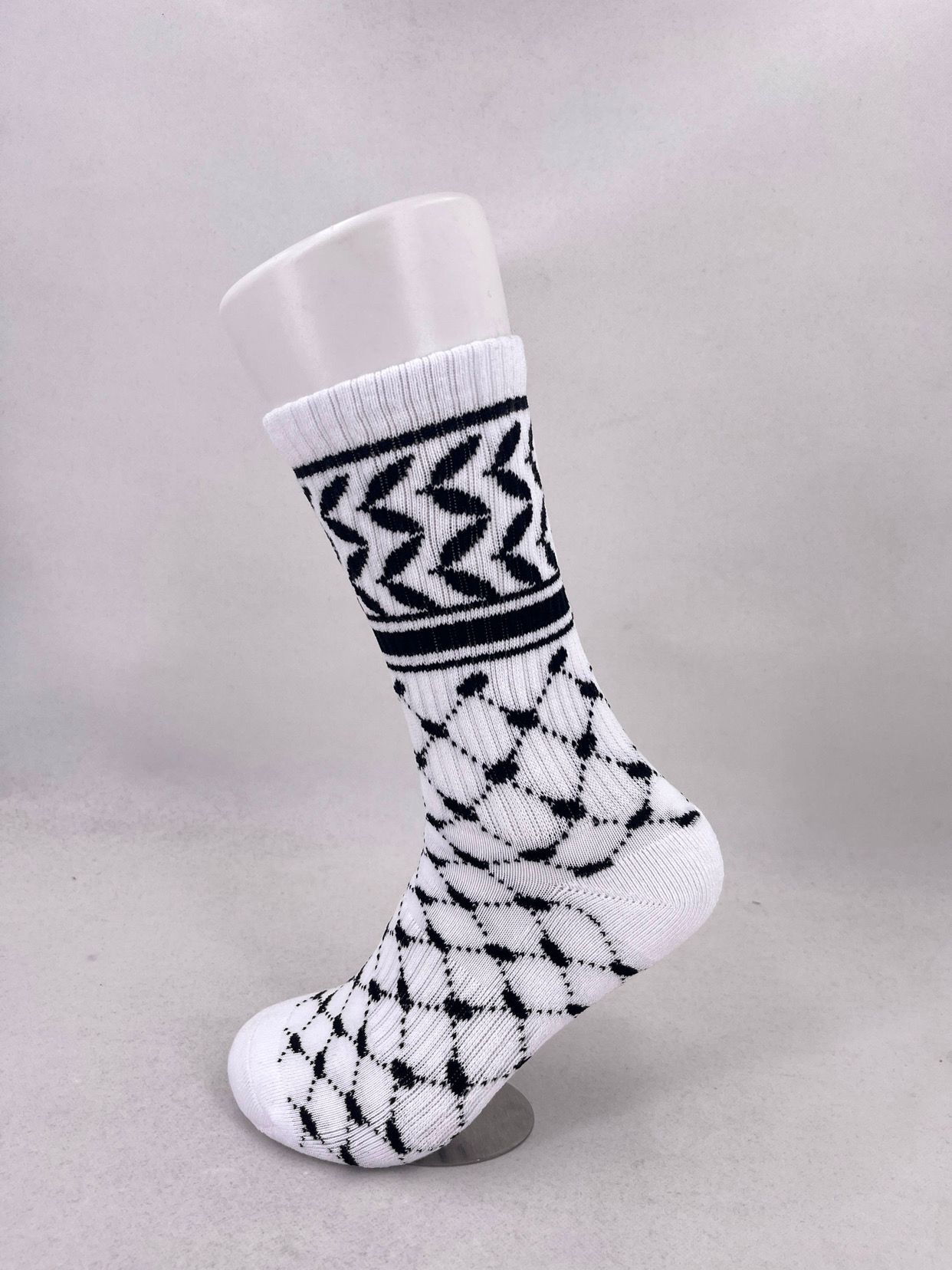 These socks were designed according to the 'Keffiyeh" that is most commonly worn in the Levant area. The Keffiyeh represents three things. The olive leaf pattern represents strength, resilience and perseverance. The Bold lines represent the trade routes going through Palestine, a long and rich history of merchants , travel and cultural exchange. The fishnet pattern represent the connection between the Palestinian sailor and the Mediterranean sea.